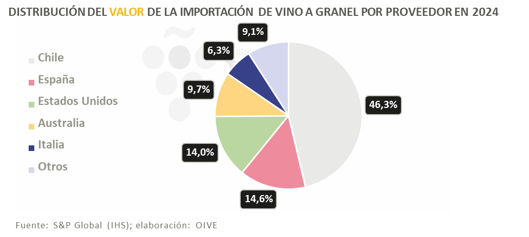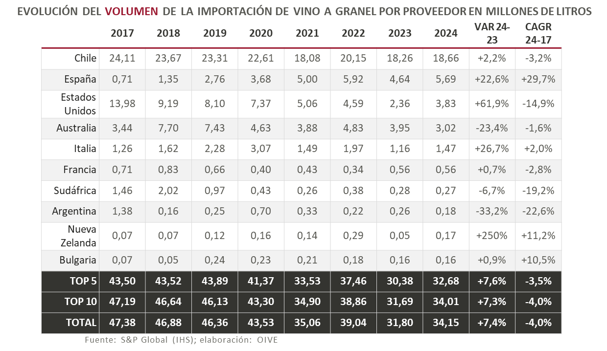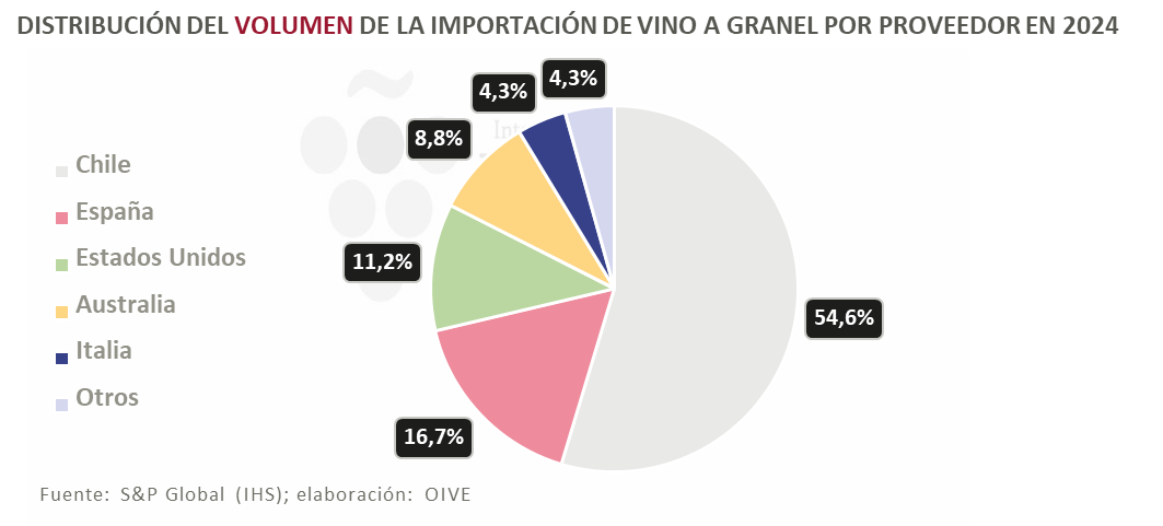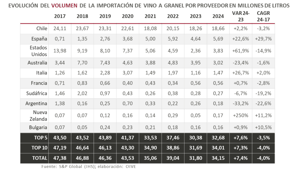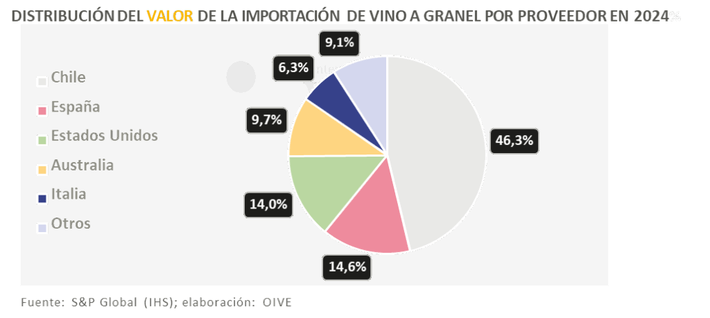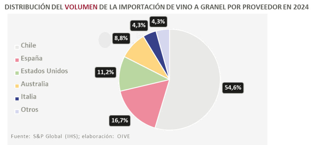 Los mayores proveedores de vino a granel en 2024 son Chile (16,01 millones de euros), España (5,06 millones de euros y Estados Unidos (4,84 millones de euros).