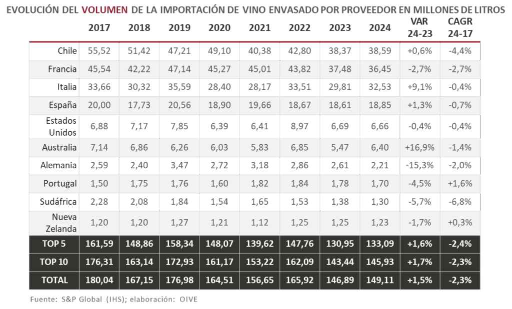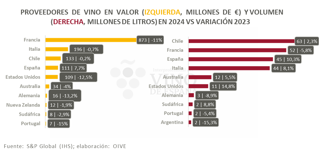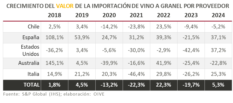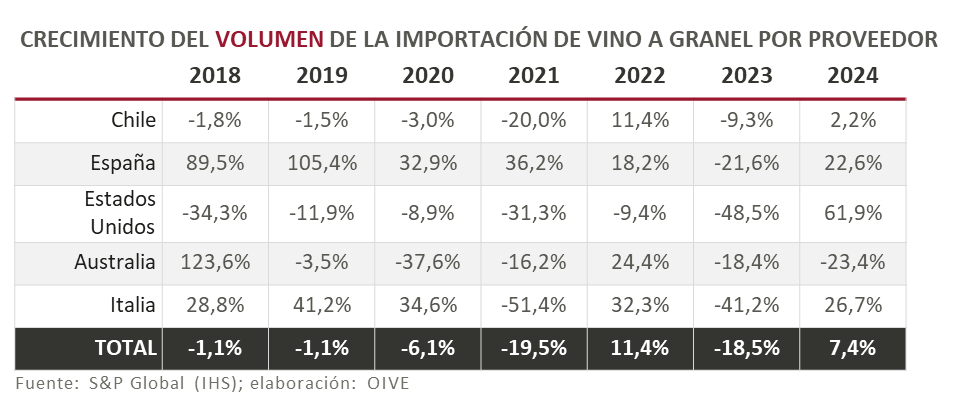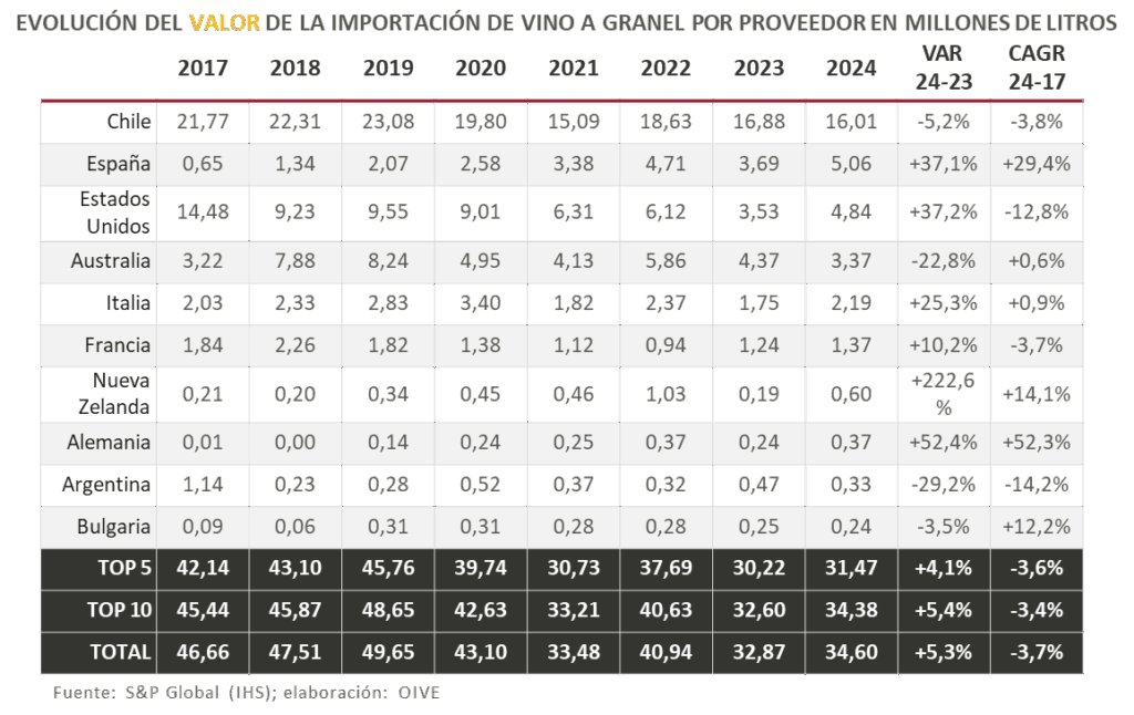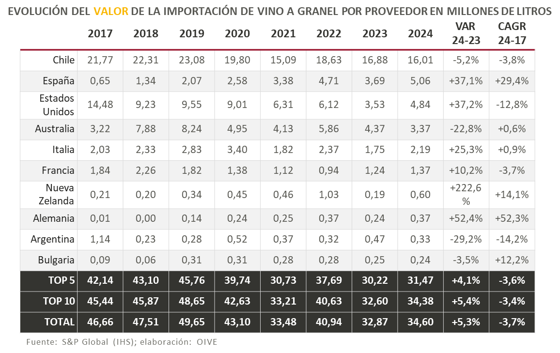 Los mayores proveedores de vino a granel en 2024 son Chile (16,01 millones de euros), España (5,06 millones de euros y Estados Unidos (4,84 millones de euros).