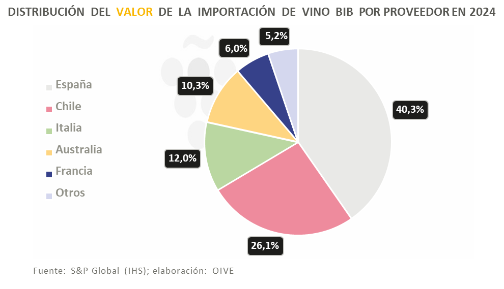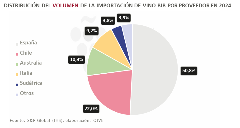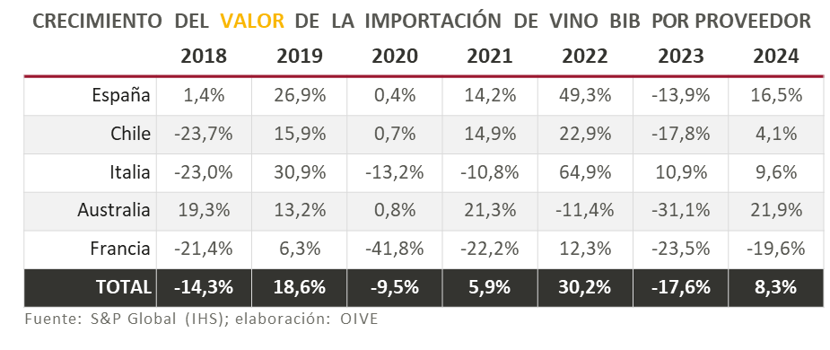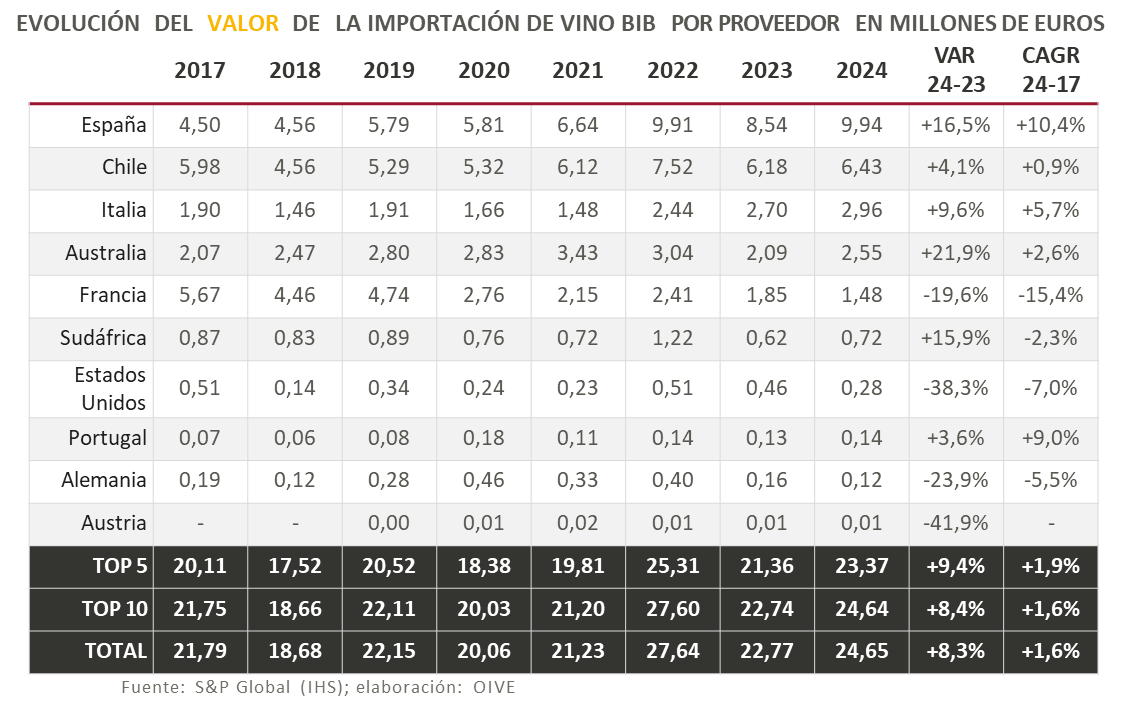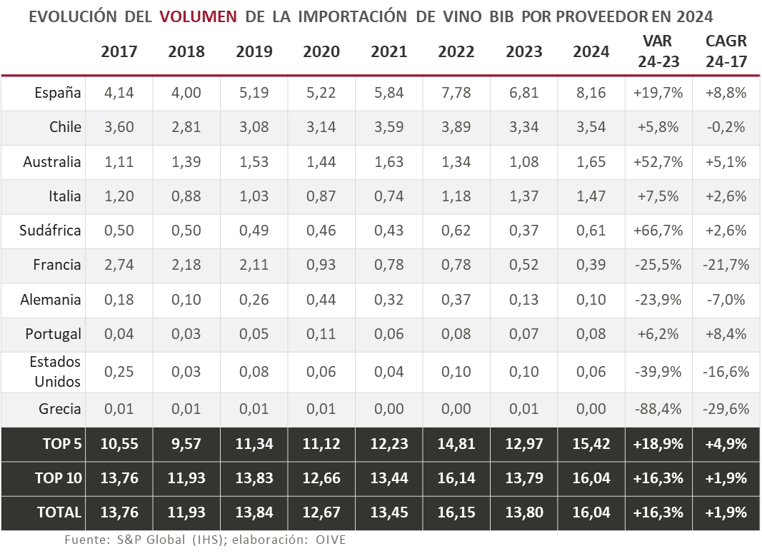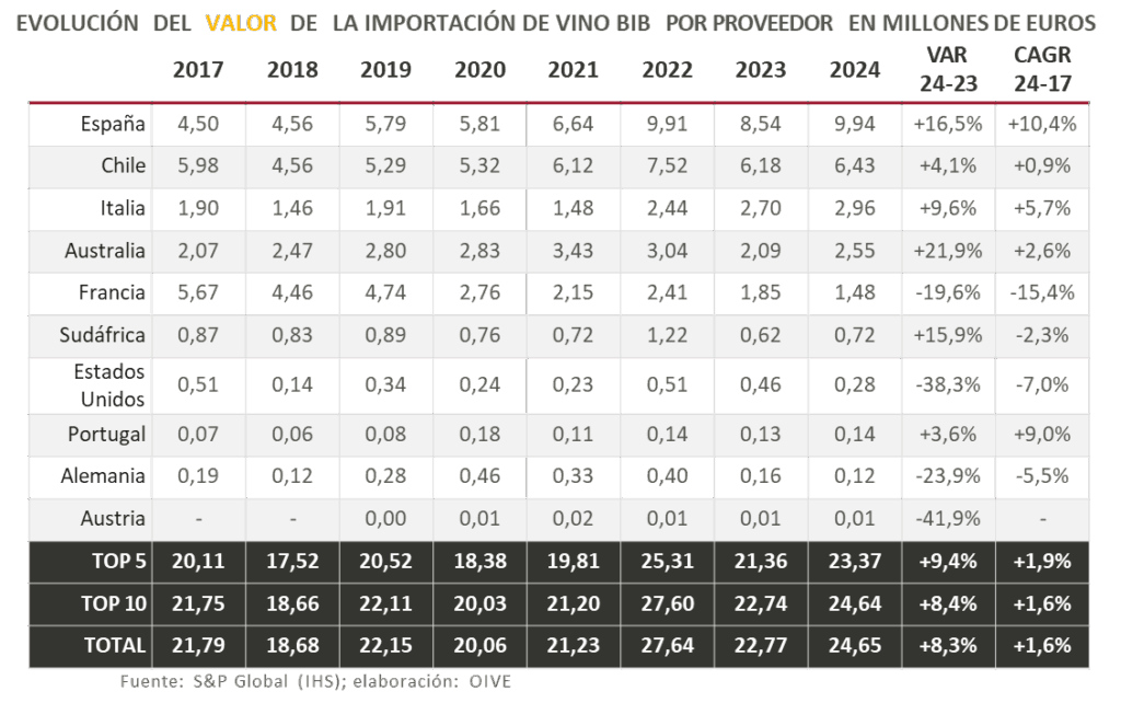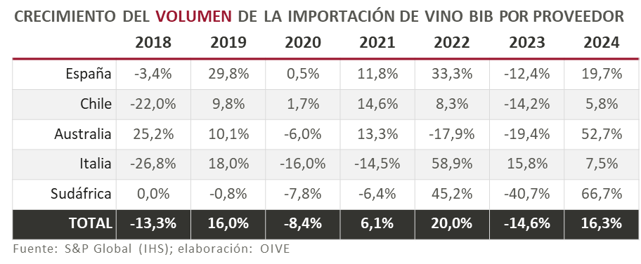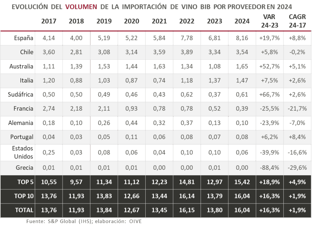 Respecto a la variación de volumen del vino BiB, este supone una de las mayores subidas por tipologías. Respecto a 2023, aumentó un 16,3%. Todos sus principales proveedores comerciales vieron aumentar sus ventas menos Francia, Alemania, Estados Unidos y Grecia.