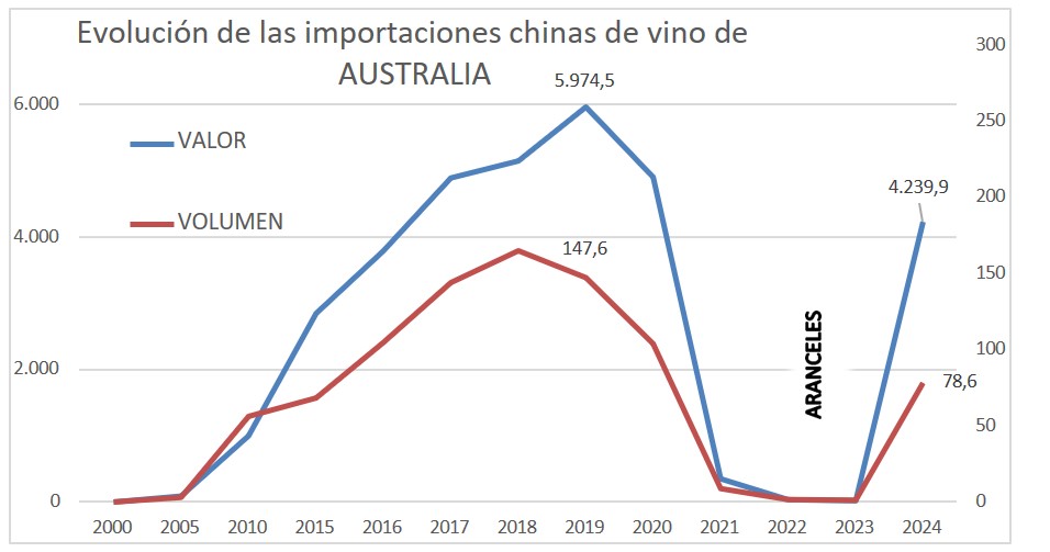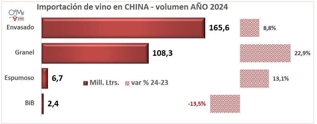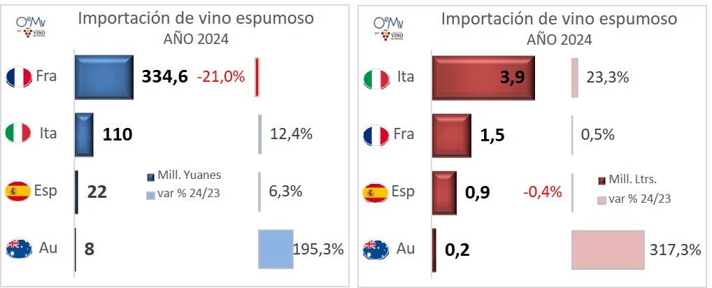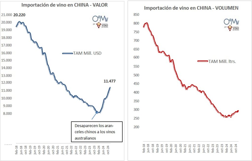 Según datos de la aduana china, analizados por la Organización Interprofesional del vino de España (OIVE), China aumentó sus importaciones de vino en 2024, un 39,6% en valor y un 13,7% en volumen, hasta los 283,1 millones de litros y los 11.477,4 millones de yuanes (unos 1.523,7 millones de euros), a un precio medio de 40,55 yuanes/litro (5,38 €/litro). La recuperación de las compras de vino australiano, tras la quita china de los aranceles del 200% en noviembre de 2020 al vino australiano, explica este crecimiento. En este contexto, mientras que Chile es el principal proveedor de China en volumen, las importaciones chinas de vino argentino sufrieron una caída de -27,4%.