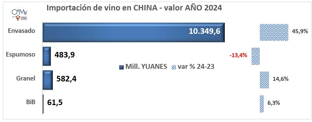 China aumentó sus importaciones de vino envasado (+46% en valor y +8,8% en volumen). Es el producto más importado, con 10.349,6 millones de yuanes y 1656,6 millones de litros, el 90% del valor y el 58,5% del volumen total de vino importado por China en 2024.