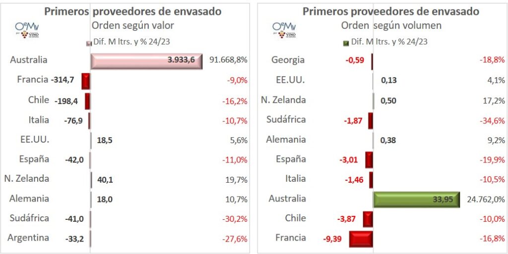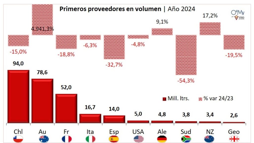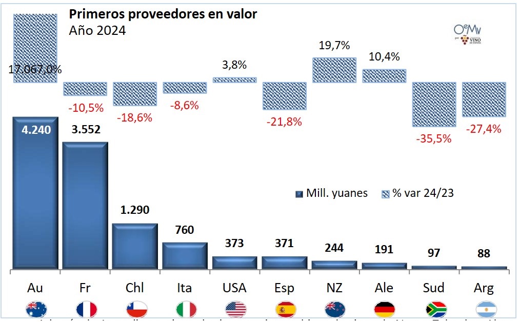 China importó vino desde 56 proveedores mundiales en 2024. Como ya se dijo, destaca el aumento de los vinos australianos en China, que se recuperan parcialmente tras desplomarse después de la entrada en vigor de unos aranceles chinos del 200% a sus vinos, en noviembre de 2020. En marzo de 2024, China retiró estos aranceles a los vinos australianos, cuyas ventas pasaron de 24,7 millones de yuanes en 2023 a casi 4.240 millones en 2024 y de 1,6 millones de litros en 2023, a 78,6 millones en 2024. Sin embargo, todavía se encuentra lejos de las cifras de 2019, cuando se situaron en los 5.974,5 millones de yuanes.