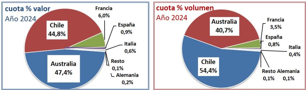 Australia recupera el liderazgo en valor y asciende a la 2ª posición en volumen, detrás de Chile, aunque lejos todavía de las ventas previas a los aranceles de 2020.