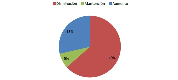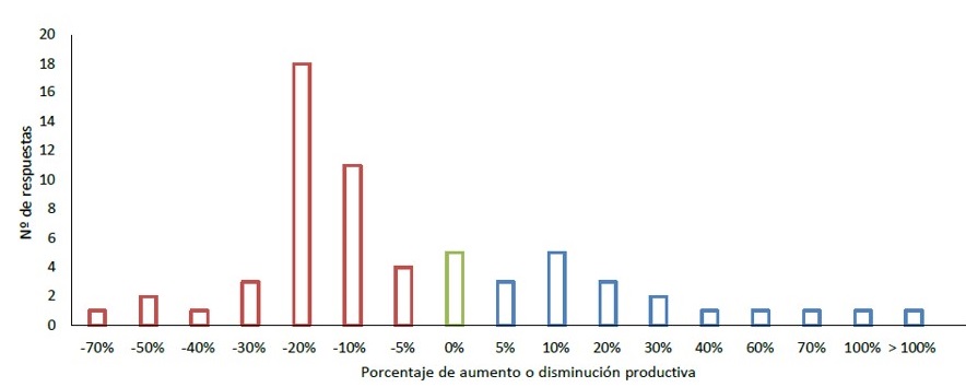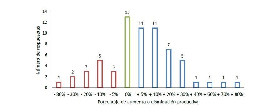 De las 63 respuestas obtenidas, 18 encuestados proyectan aumentos en la producción, mientras que 40 anticipan una disminución del rendimiento. De los encuestados, 5 estiman que su producción será similar a la de la temporada anterior. Por otro lado, 18 encuestados esperan una disminución de un 20% del rendimiento con respecto al año anterior, 11 prevén una reducción del 10%, y 1 reporta un aumento significativo de más del 100% en su producción (Figura 3).