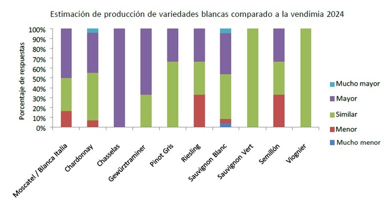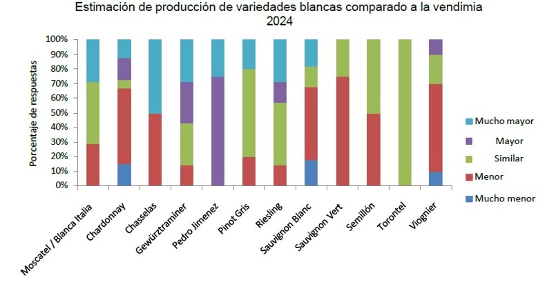 La mayoría de los encuestados proyectan una disminución menor en la producción de Chardonnay y Sauvignon Blanc (17 y 14 respuestas, respectivamente). En variedades como Chasselas, Sauvignon Vert, Semillon y Viognier se espera de forma mayoritaria una disminución menor del rendimiento en comparación a la temporada pasada. La mayoría de las respuestas estiman que Moscatel de Alejandría, Pinot Gris, Riesling y Torontel tendrán un rendimiento similar a la de la temporada anterior (Figura 6).
