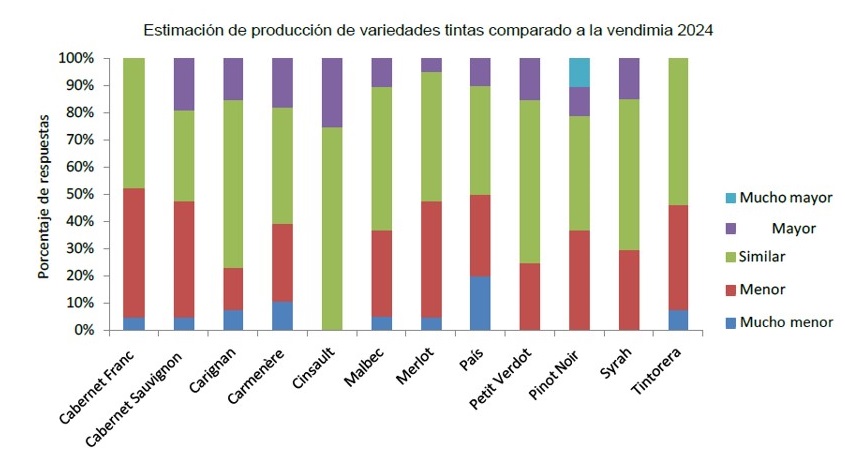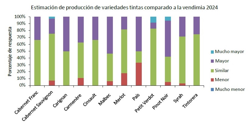 Respecto a las variedades tintas: la mayoría de las respuestas estiman que la producción será similar a la temporada anterior en Cabernet Franc, Cabernet-Sauvignon, Carmenère, Cinsault, Merlot, Petit Verdot, Syrah y Tintorera (cv. Aspiran Bouschet). La variedad que presentó el mayor porcentaje de aumento de producción correspondió a la variedad Malbec, seguida por País (cv. Listán Prieto) y Pinot Noir (Figura 7).