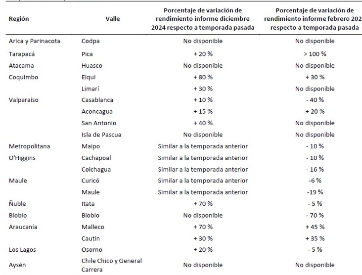 A nivel país, el reporte señala un rendimiento estimado en 13,2% menor que en la temporada anterior, especialmente para las variedades Chardonnay y Cabernet Sauvignon. Esta caída en el rendimiento es consecuencia principalmente de las olas de calor, menor disponibilidad hídrica y mayor incidencia de plagas y enfermedades.