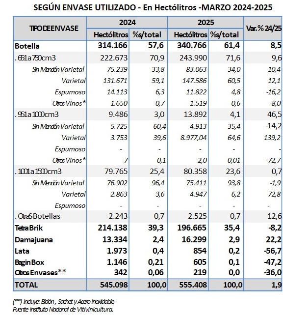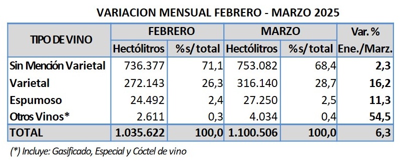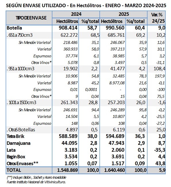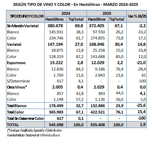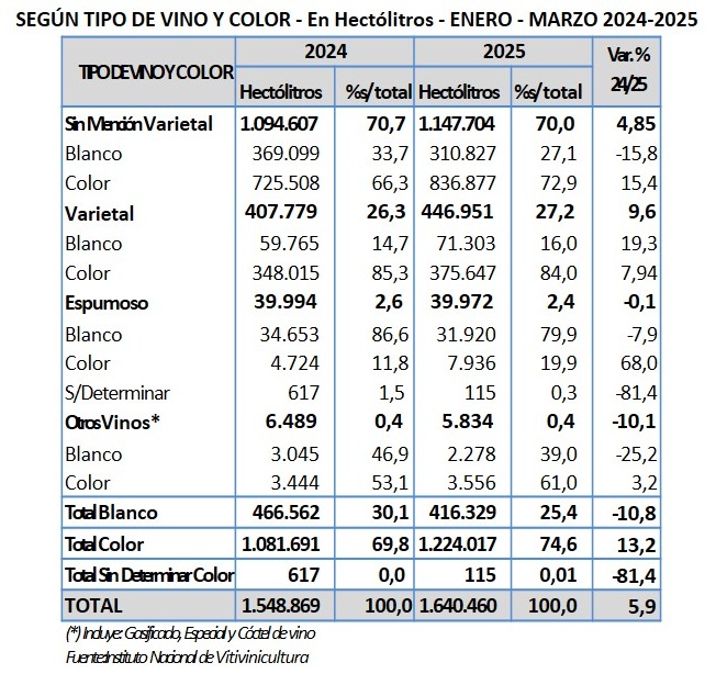 Según el último informe del Instituto Nacional de Vitivinicultura (INV), entre enero y marzo de 2025 las bodegas despacharon al mercado interno argentino 1.640.460 hl de vino (+5,9% con respecto al mismo período de 2024). Los tintos crecieron un 13,2%, pero los blancos fueron a la baja con -10,8%.