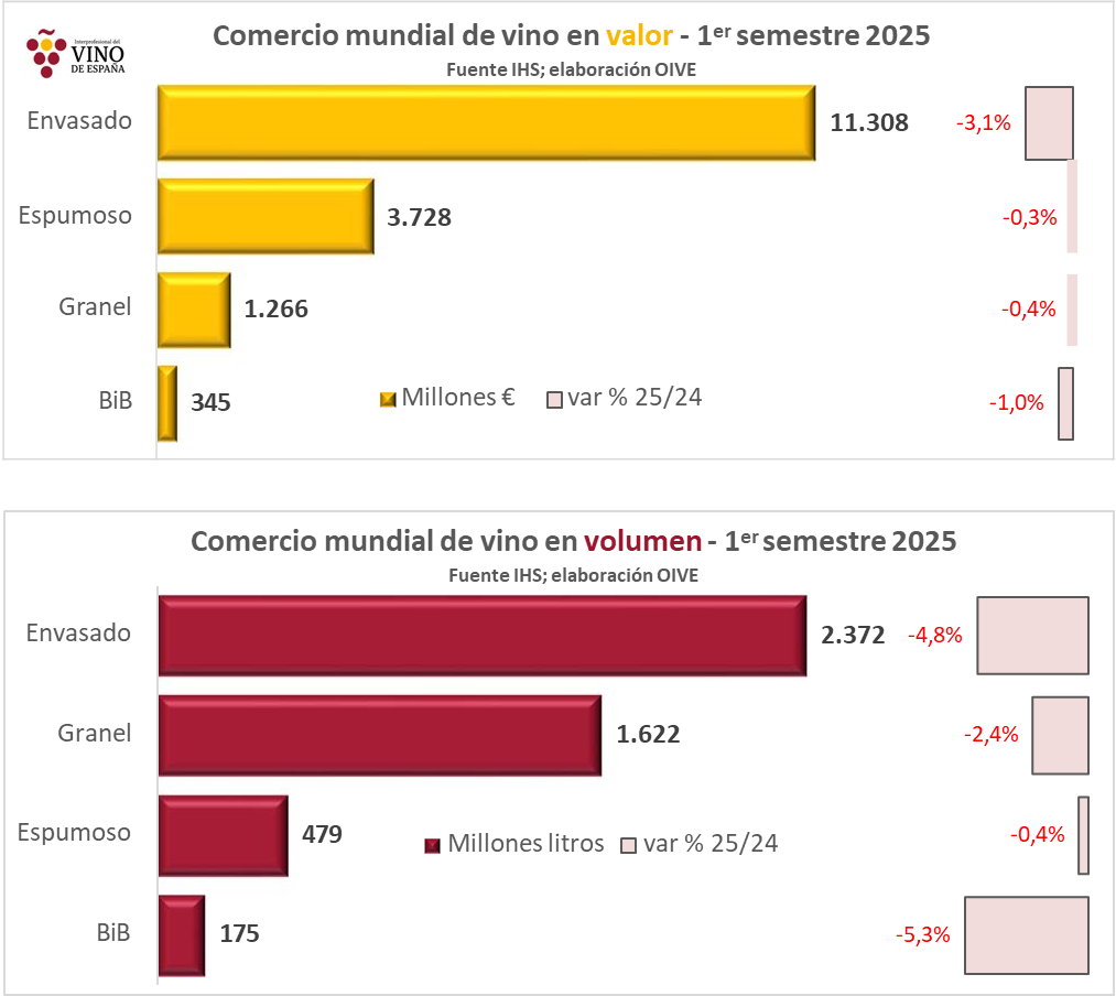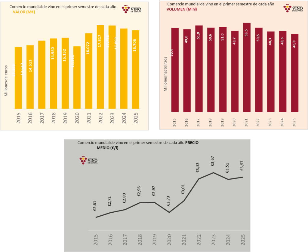 El comercio internacional de vino registró evolución negativa en el primer semestre de 2025,con caídas del -2,3% en valor y del -3,7% en volumen, hasta situarse en 4.682,5 millones de litros, por valor de 16.704,9 millones de euros. Es decir, el comercio mundial de vino se ha reducido en 180,8 millones de litros y en 387,7 millones de euros en la primera mitad de 2025, respecto a la primera mitad de 2024. Los precios medios han aumentado un +1,5%, pasando de 3,51 €/litro en el primer semestre de 2024 a 3,57 €/litro en el primer semestre de 2025. El vino envasado lidera las pérdidas, aunque en volumen cayeron todos los productos analizados y en valor, solo aumentó el mosto (partida 220430).