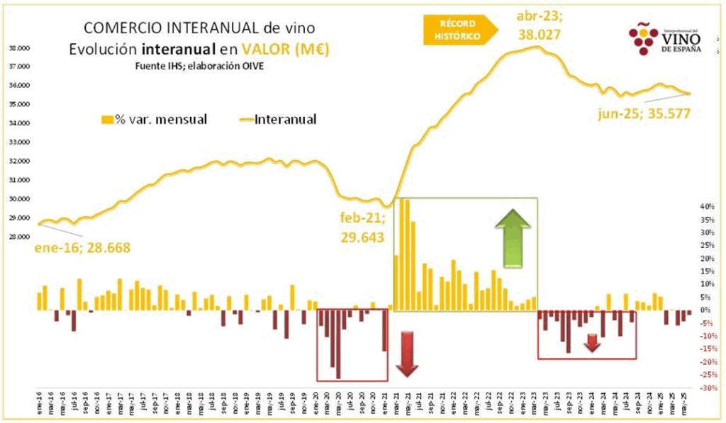 Si abarcamos un periodo mayor de tiempo, teniendo en cuenta los datos interanuales a junio de 2025 (doce meses comprendidos entre julio de 2024 y junio de 2025) observamos que el comercio mundial de vino alcanzó los 9.656,6 millones de litros (-2,3%), por un valor de 35.576,6 millones de euros (+0,4%), con un precio medio de 3,68 €/litro (+3%). En comparación con el interanual a junio de 2024, se comercializaron 223,3 millones de litros menos, aunque el valor creció en 145,2 millones de euros. El precio medio se incrementó en 7 céntimos.