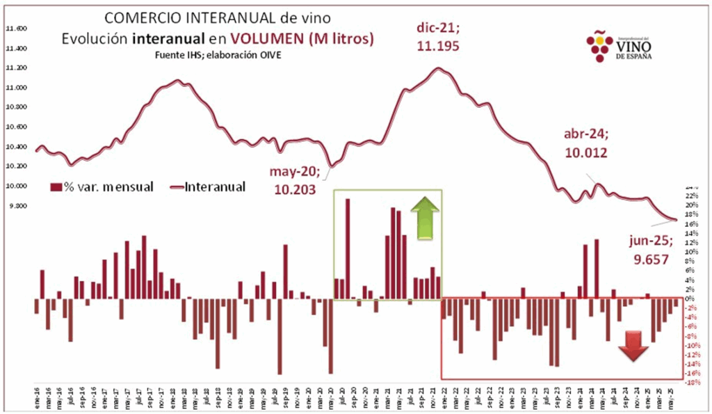 Los gráficos siguientes muestran la evolución del comercio mundial de vino desde el interanual a enero de 2016 hasta el interanual a junio de 2025. Reflejan la fuerte recuperación registrada tras la pandemia, que permitió superar ampliamente la caída de 2020.