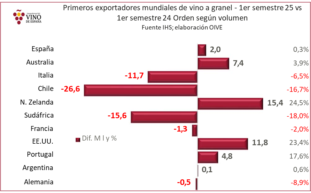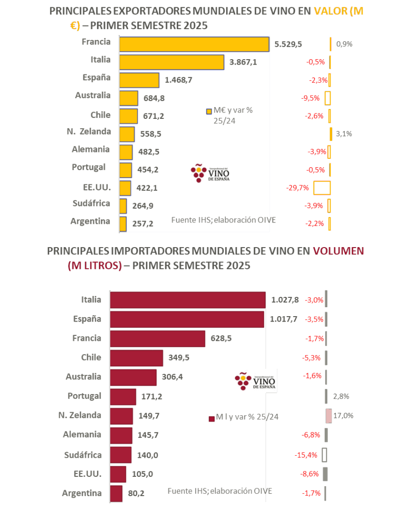 Los 11 principales proveedores mundiales de vino representaron el 88% del comercio mundial de vino tanto en valor como en volumen. Y son los mismos en ambas clasificaciones (variando el puesto en valor y en volumen). En el primer semestre de 2025, solo aumentaron su facturación, Francia (+0,9%) y Nueva Zelanda (+3,1%). En términos de volumen, también aumentó sus exportaciones de vino Nueva Zelanda (+17%) y, además, Portugal (+2,8%), cayendo el resto. España cerró la primera mitad de 2025 en negativo, con caídas del -2,3% en valor y del -3,5% en volumen, aunque se mantiene como tercer exportador mundial de vino en valor y segundo en volumen.
