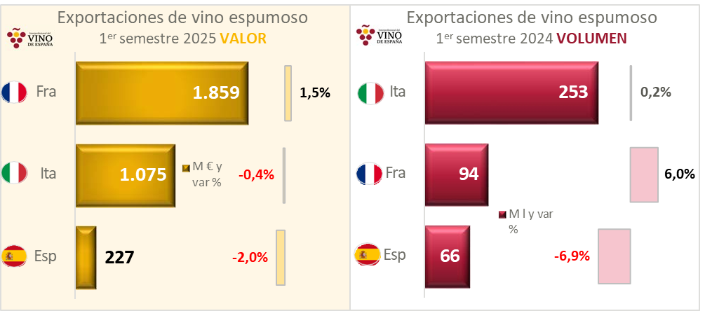 España es el tercer exportador mundial de vino espumoso en valor y en volumen, con 227 millones de euros (-2%) y 66 millones de litros (-6,9%), perdiendo cuota al caer por encima de la media mundial. Entre los tres principales proveedores, fue el que peor evolución presentó en los 6 primeros meses de 2025, dejando de exportar 4,9 millones de litros de vino espumoso y de facturar, 4,6 millones de euros.