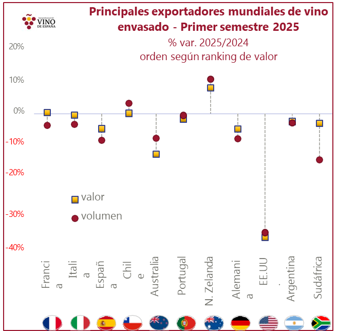 En el lado positivo, solo Nueva Zelanda (+7,7% en valor y +10% en volumen) y Chile (+0,1% en valor y +3% en volumen) aumentaron sus exportaciones de vino envasado en valor y en volumen en los seis primeros meses de 2025.
