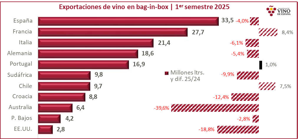En términos de volumen, es España el primer proveedor mundial de vino en envases de entre 2 y 10 litros, con 33,5 millones de litros (-4%), seguido de Francia y de Italia.