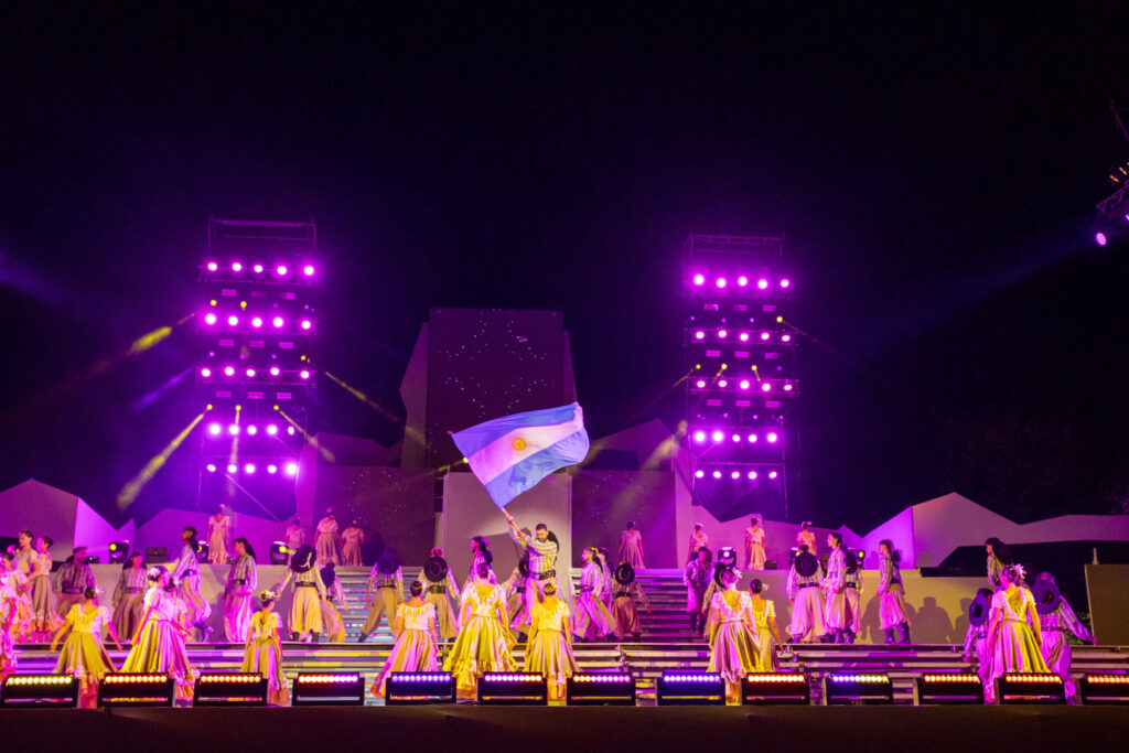 Es que de repente, el dispositivo escenográfico se convirtió en una réplica del Cerro de la Gloria como símbolo de la gesta sanmartiniana que inspiró esta Vendimia de la Ciudad de Mendoza 2026 y contagió de patriotismo, con los ojos puestos en las nuevas generaciones que forjan la evolución de la ciudad a partir de su historia. Esto también se vio reflejado desde la concepción del diseño gráfico del afiche institucional, al transformar en tipografía la caligrafía original de puño y letra de José de San Martín, para recrearlo en las diferentes piezas.