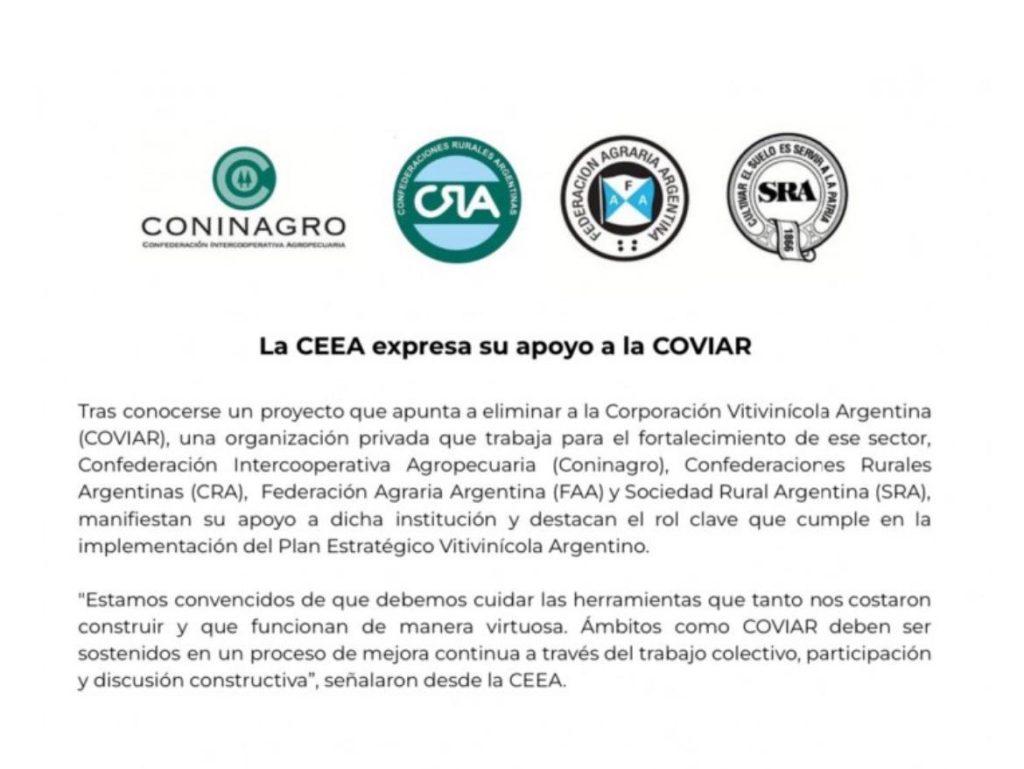 “Tras conocerse un proyecto que apunta a eliminar a la Corporación Vitivinícola Argentina (Coviar), una organización privada que trabaja para el fortalecimiento de ese sector, Confederación Intercooperativa Agropecuaria (Coninagro), Confederaciones Rurales Argentinas (CRA), Federación Agraria Argentina (FAA) y Sociedad Rural Argentina (SRA), manifiestan su apoyo a dicha institución y destacan el rol clave que cumple en la implementación del Plan Estratégico Vitivinícola Argentino.