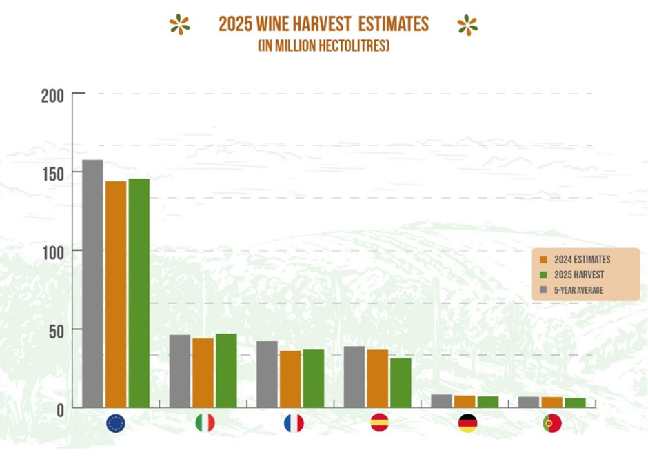 Según un informe se la asociación agraria Copa-Cogeca, se estima que el sector vitivinícola europeo producirá 145,5 millones de hectolitros (Mhl) de vino para 2025, lo que representa un aumento del 1% en comparación con el año anterior. Aunque los volúmenes se están recuperando, todavía se mantienen un 7,5% por debajo del promedio de los últimos 5 años. Los tres mayores productores de vino de la Unión Europea -Italia, Francia y España- han reducido su producción combinada en 1,5% en comparación con la cosecha de 2024.