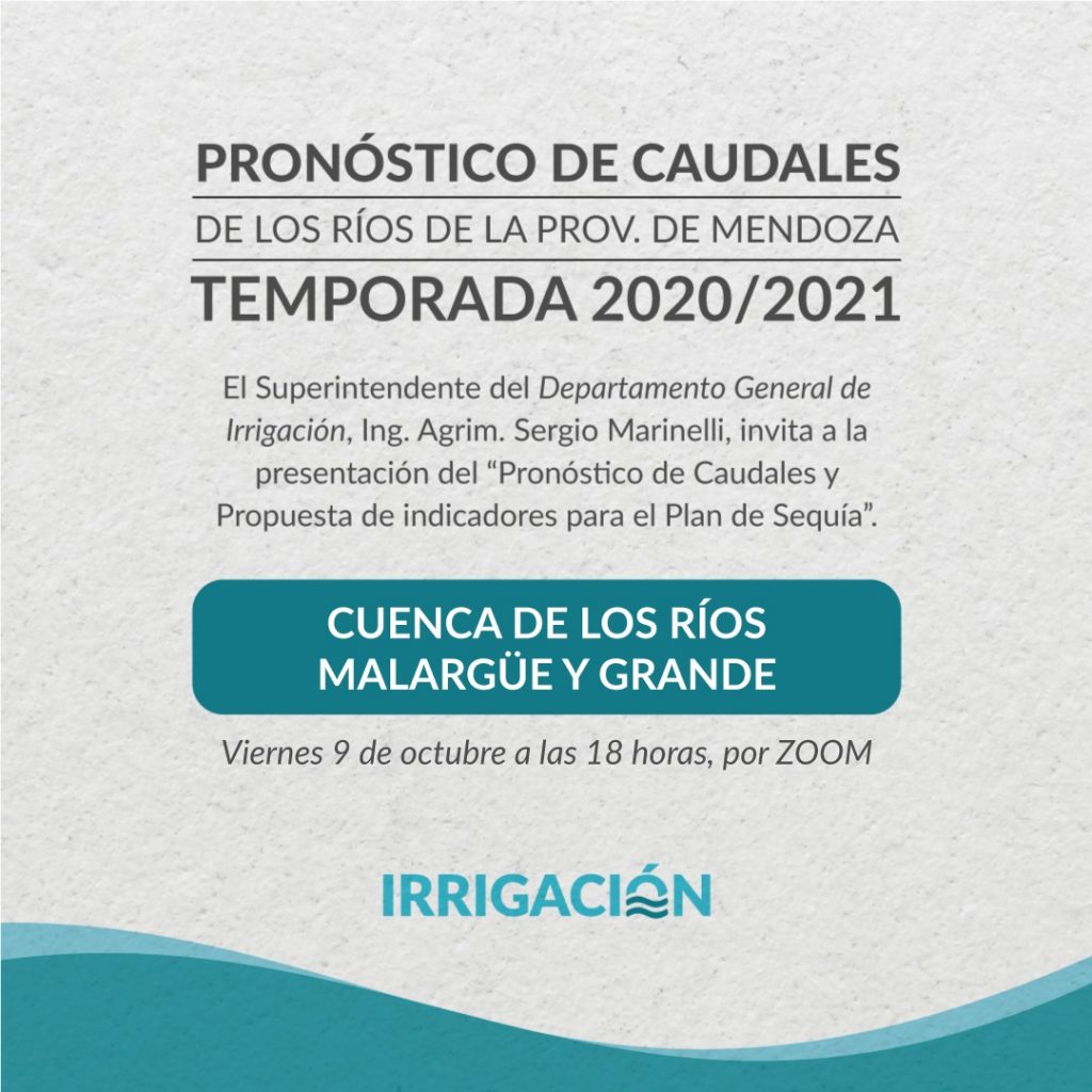 Como cada temporada en el mes de octubre, el Departamento General de Irrigación (DGI) presenta el «Pronóstico de Escurrimiento de Aguas Superficiales de Mendoza. Se trata de una estimación de los caudales de los ríos que permite establecer un plan de manejo de los embalses para la provisión de agua para riego, energía y consumo, entre otros usos. Este año, la presentación será online entre el lunes 5/10 y el viernes 9/10.