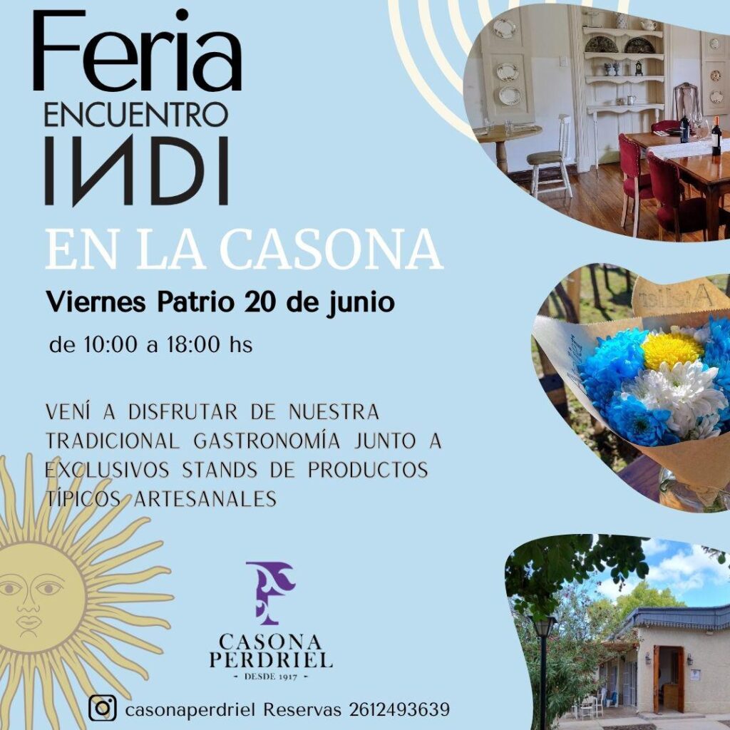 Se trata de una iniciativa cultural y turística que se desarrollará los días viernes 20 y el sábado 21 de junio en varios departamentos de esta provincia. Participarán 34 casas de valor histórico, patrimonial o cultural, que abrirán sus puertas a vecinos y turistas, sin costo de ingreso. Allí se podrá pasear y comprar artículos regionales, alimentos y regalos elaborados por artesanos y productores mendocinos, a precios razonables. Una de estas actividades es el paseo por la Casona Perdriel (foto principal), donde el 20 de junio, de 10 a 18 hs., se montará la ya tradicional Feria Encuentro Indi.