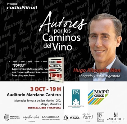 Llega al ciclo «Autores por los Caminos del Vino» el reconocido periodista de investigación -prosecretario de Redacción del diario La Nación-, escritor y abogado oriundo de La Plata. En esta ocasión, la serie de entrevistas y charlas moderadas por el periodista mendocino Andrés Gabrielli se enfocará en la recientemente publicada obra de Alconada Mon que cuenta la historia de dos espías rusos que vivieron en Buenos Aires durante más de una década bajo identidades falsas. Será en el Auditorio Marciano Cantero de Maipú, Mendoza, el viernes 3 de octubre a las 19 hs, con entrada libre previa inscripción online. Allí también se podrán degustar vinos de bodegas mendocinas.