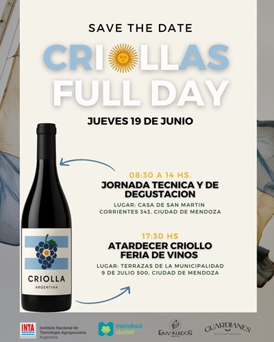 Con el apoyo de la Municipalidad de la Ciudad de Mendoza, el jueves 19/6 se realizará el «Criolla Full Day», organizado por la enóloga Victoria Brond, fundadora de Guardianes de la Naturaleza y la sommelier Romina Rolón de Envinados Mendoza.
