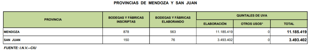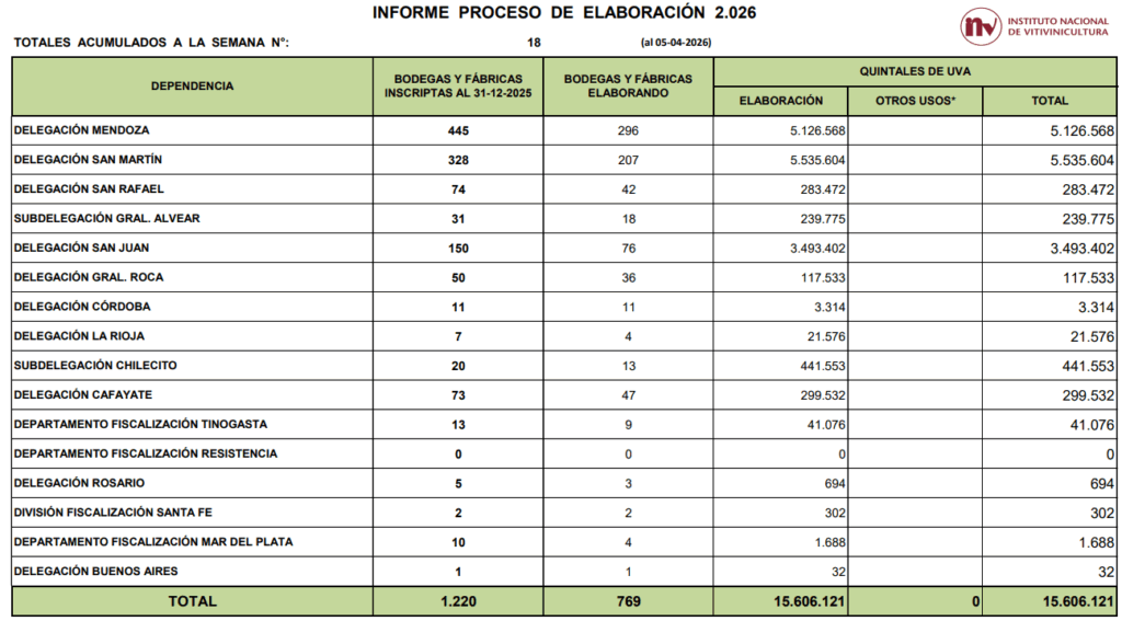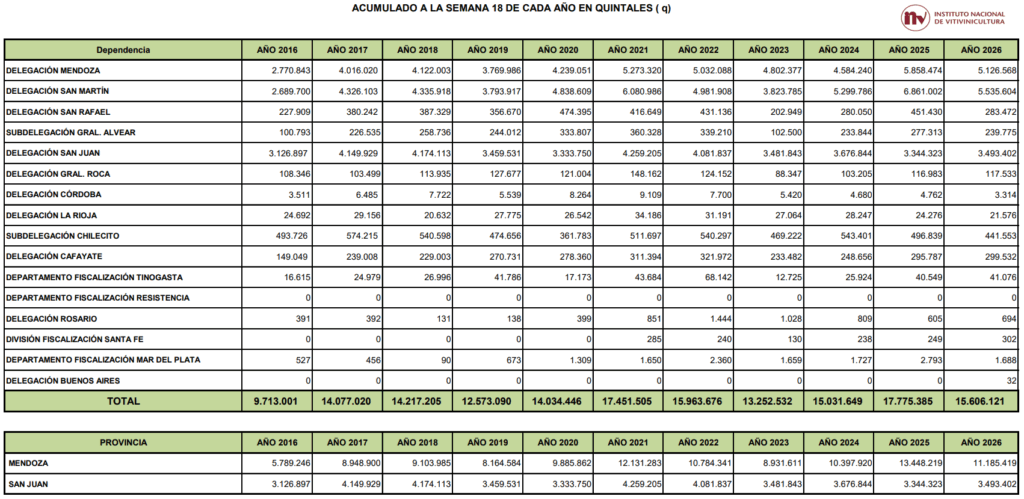A continuación replicamos algunos de los cuadros estadísticos divulgados hoy 7/4/2026 por el Instituto Nacional de Vitivinicultura (INV).