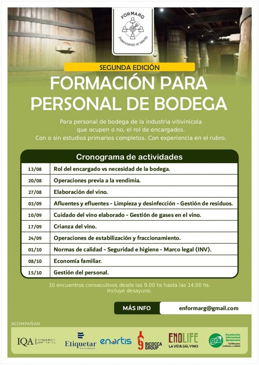 Del 13 de agosto al 15 de octubre de 2025 se realizará la segunda capacitación anual, «Formación para personal de bodega», consistente en 10 encuentros, cada día de 9 a 14 hs, en la Bodega Polo (Malabia 255, Carrodilla, Luján de Cuyo, Mendoza).