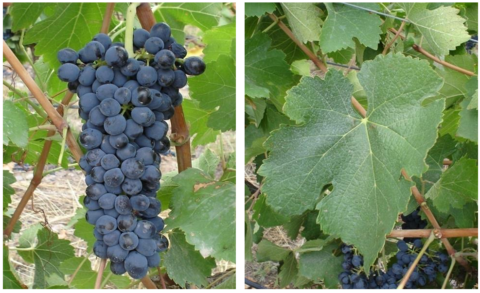 Ampelográficamente se puede distinguir por su hoja trilobada mediana plegada con su lóbulo centras plano y con los lóbulos laterales doblados o plegados hacia arriba, de color verde opaca, con indumento en telaraña abundante, seno peciolar en U con tendencia a lira y punto peciolar blanquecino. Racimo mediano, bien lleno a compacto, cilíndrico con pedúnculo bastante largo. Las bayas son elípticas color negro azulado, medianas, de sabor neutro y pulpa blanda.