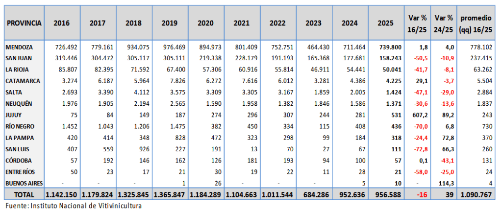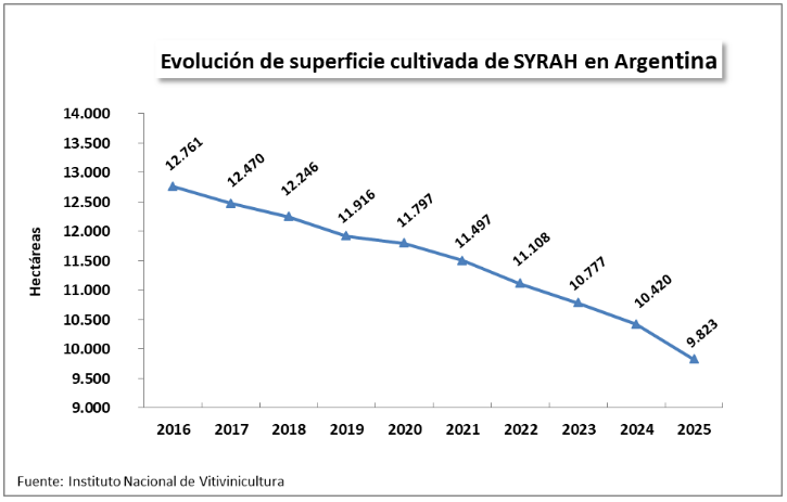 La cantidad de hectáreas de Syrah en Argentina ha disminuido un 23% en el período 2016-2025. En Mendoza disminuyó un 17%, en San Juan un 38,6% y en el resto del país un 30,7%.