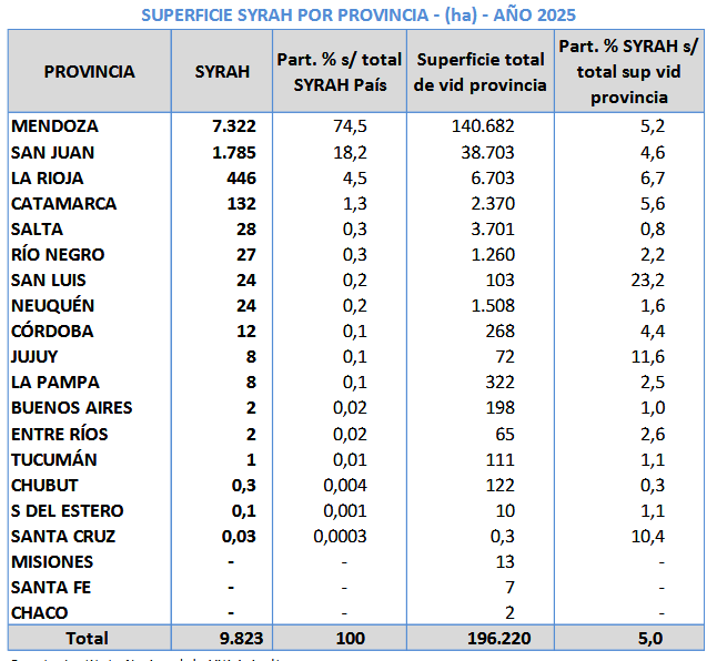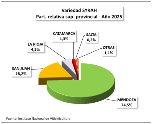 La provincia de Mendoza tiene la mayor cantidad de Syrah del país, alcanzando en 2025 las 7.322 ha (74,5%), seguida por San Juan con 1.785 ha (18,2%) y el resto de las provincias con 715 ha (7,3%).