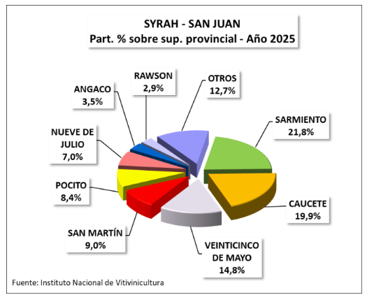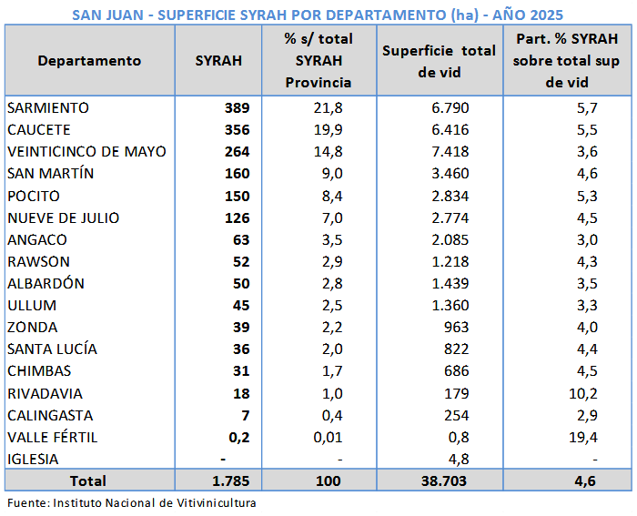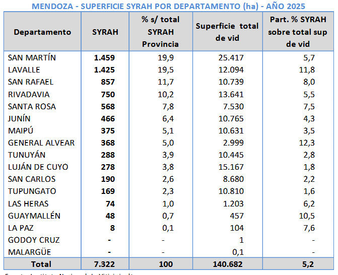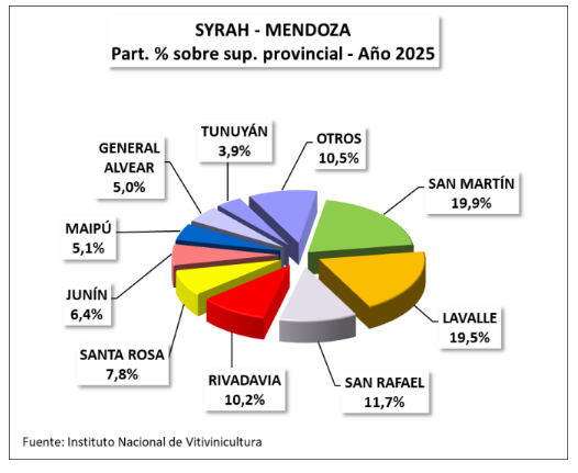 En la provincia de Mendoza los departamentos que más quintales de Syrah cosecharon en 2025 fueron San Martín, Lavalle y Rivadavia. En San Juan se cosechó más Syrah en Caucete y Sarmiento.