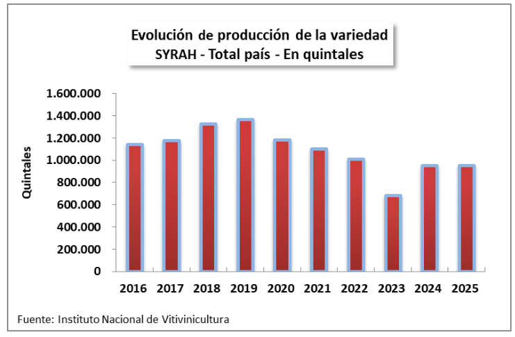 La producción total en el país de la variedad Syrah, en 2025, fue de 956.588 quintales, un 0,4% superior a la del año anterior. La distribución por provincia de origen en los últimos años se muestra en la siguiente tabla: