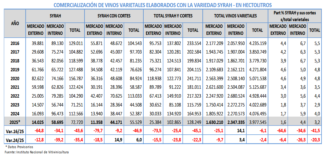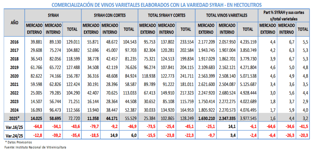 En 2025 se comercializaron 72.720 hl de vino varietal puro de Syrah y 55.529 hl de Syrah en corte con alguna otra variedad. El total comercializado de vinos varietales en el país fue de 3.977.545 hl y las ventas de vinos varietales Syrah (puro+cortes) representaron el 3,2% de ese total.