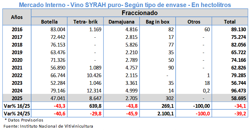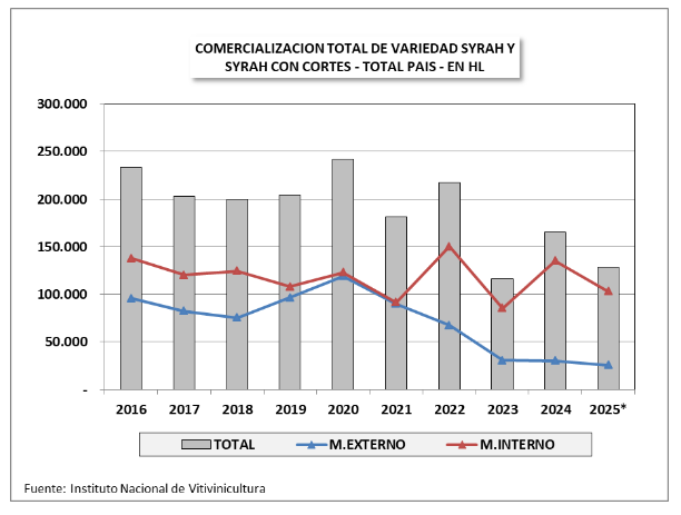 En el año 2025 se comercializaron 102.865 hl de vinos varietales Syrah (puro + cortes). El 57% corresponde a varietal puro y el 43% a cortes con otra variedad. Las ventas al mercado interno de vinos con Syrah han disminuido en el último año, mostrando una baja del 23,8% respecto al año 2024. El varietal puro disminuyó un 39,2% mientras que los cortes aumentaron un 14,9%, comparado con el año anterior.