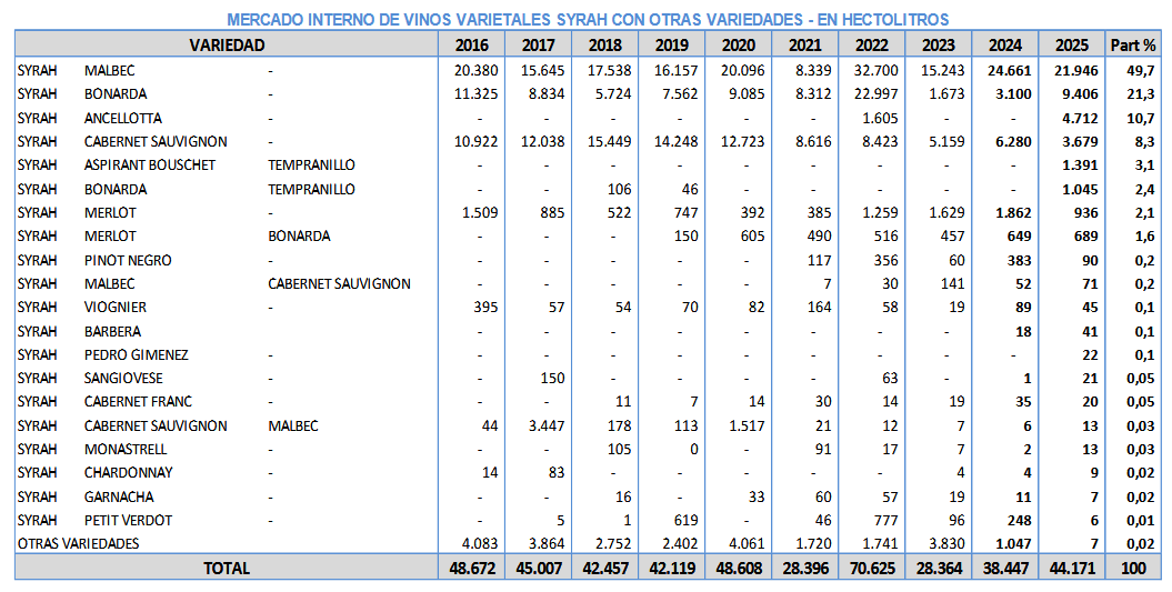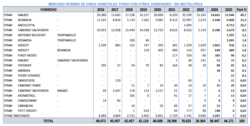 En 2025, el principal corte enviado al mercado interno con Syrah como primer varietal, fue Syrah-Malbec, que concentra el 49,7% del total de los cortes. Le siguen Syrah-Bonarda (21,3%) y Syrah-Ancellotta (10,7%).