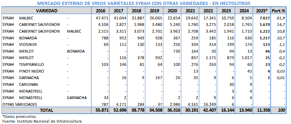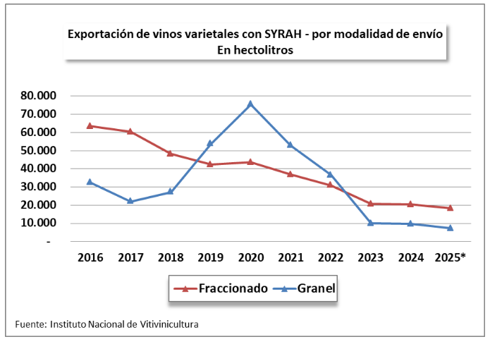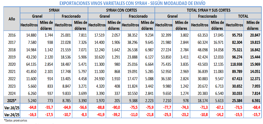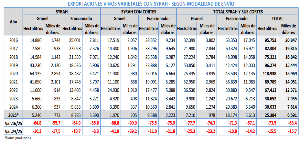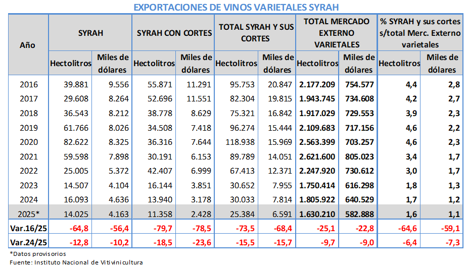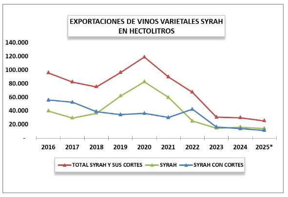 Durante el año 2025 las exportaciones de vinos varietales elaborados con la variedad Syrah alcanzaron un total de 25.384 hl, por un valor FOB de 6.591.000 dólares. Las exportaciones de este varietal han disminuido en volumen un 73,5% y en valor un 68,4% con respecto al año 2016. En el último año también se observa una disminución, llegando a exportar un 15,5% menos en volumen que en 2024.