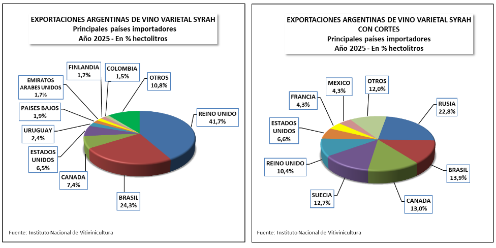El varietal Syrah fue el séptimo más exportado en 2025. Participa con el 1,6% del volumen y el 1,1% del ingreso de divisas de las exportaciones de vinos varietales. El principal destino de los vinos varietales puros Syrah en 2025 fue Reino Unido, seguido por Brasil, Canadá, Estados Unidos, Uruguay y Países Bajos. Mientras que para Syrah con cortes, los principales destinos fueron Rusia, Brasil, Canadá, Suecia, Reino Unido y Estados Unidos.