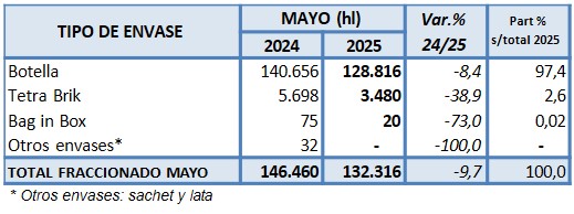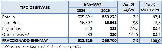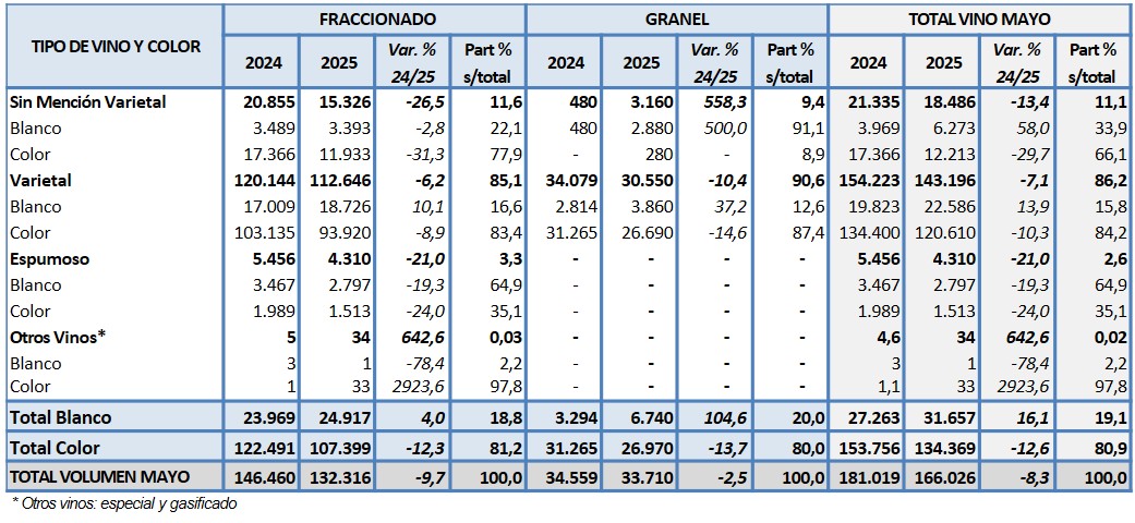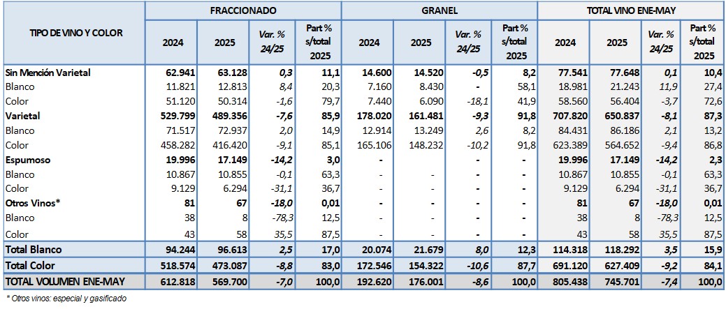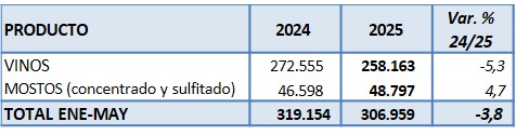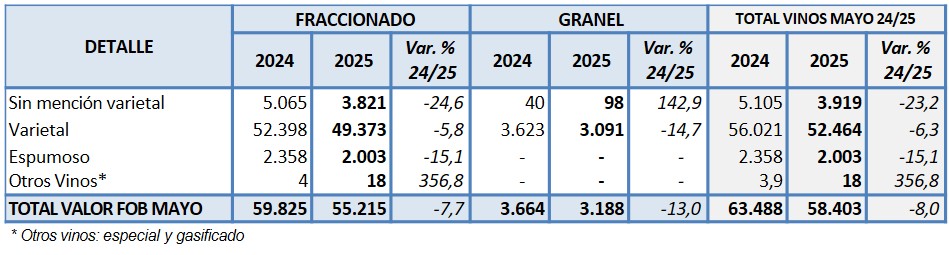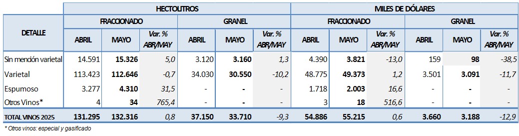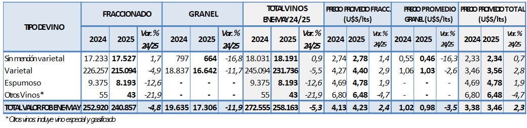 Argentina exportó en los cinco primeros meses de 2025, 74,6 millones de litros de vino (-7,4 % que en 2024), a un valor FOB de U$S 258.163.000 (-5,3%) . Se exportaron 6 millones de litros menos con respecto al año 2024. De ese total, 57 millones (76,4%) corresponden a vinos fraccionados (-7%) y 17,6 millones (23,6%) son vinos a granel (-8,6%).