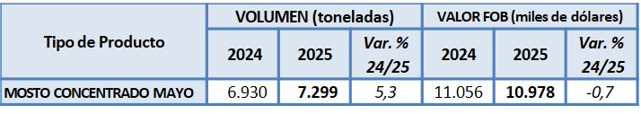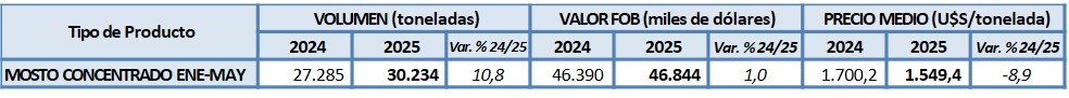 Las exportaciones de mosto concentrado en estos cinco meses del año ascienden a 30.234 toneladas, un 10,8% más en volumen y un 1% más de ingreso de divisas respecto al mismo período del año anterior. El precio promedio del mosto concentrado en el acumulado del año llega a 1.549,4 dólares/tonelada y en mayo se comercializó a un precio promedio de 1.504 dólares por tonelada