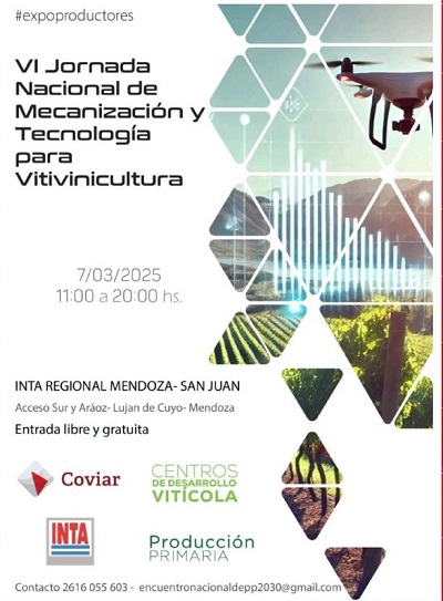 El 7 de marzo próximo, de 11 a 20 hs, la Corporación Vitivinícola Argentina (Coviar) junto al Instituto de Tecnología Agropecuaria (INTA) Regional Mendoza-San Juan, realizarán la VI Jornada Nacional de Mecanización y Tecnología para la Vitivinicultura, en la sede del INTA de Luján de Cuyo, Mendoza. La participación es libre y gratuita, con inscripción previa.