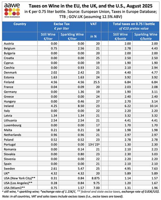 La Asociación Estadounidense de Economistas del Vino (AAWE) publicó información sobre los impuestos al vino que cobran en la Unión Europea, Reino Unido y Estados Unidos. Entre los datos obtenidos se observa que Finlandia, Irlanda y Reino Unido cobran los impuestos más altos, mientras que Portugal, Luxemburgo y algunas ciudades estadounidenses -que tienen sus propios impuestos, independientemente de los del gobierno de EEUU- se encuentran en el extremo más bajo. En cuanto a los aranceles impuestos por el gobierno de Trump, entre junio y julio se registraron pagos récord por U$S60 millones.