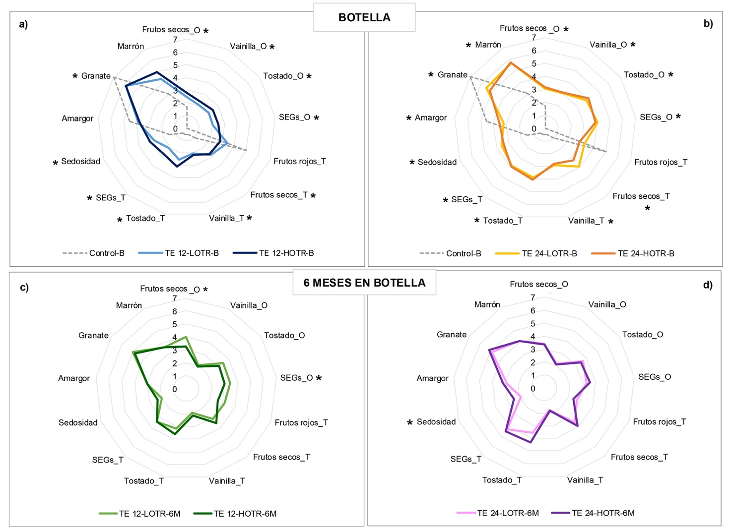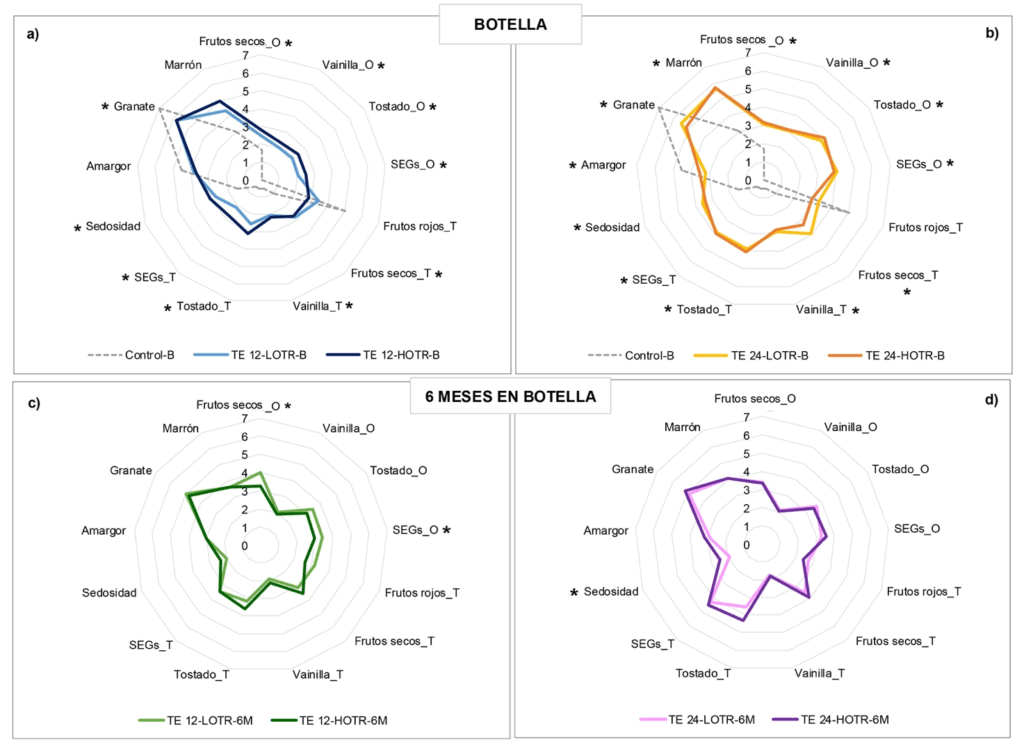 - Los vinos TE-12 (Figura 1c) mostraron una mayor intensidad en los descriptores tostado_O, SEGs_O y SEGs_T cuando se aplicó el tratamiento LOTR (baja tasa de transferencia de oxígeno).