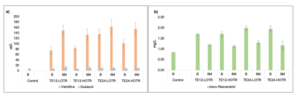 Los vinos tratados mostraron un perfil sensorial más suave y armonioso, con notas bien integradas de tostado, vainilla, frutos secos y SEGs, que el vino control. Los compuestos fenólicos disminuyeron, excepto el trans-resveratrol, que aumentó principalmente con las dosis más altas de SEGs. En cuanto a los compuestos volátiles, la presencia de vainillina y guayacol en los vinos tratados fue especialmente notable, sobre todo después de seis meses en botella.