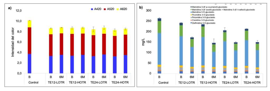 La disminución de antocianinas fue más pronunciada con dosis más altas de MOX (Figura 3b), aunque el efecto varió entre los distintos compuestos antociánicos. Tanto la cantidad de oxígeno como el modo en que se hace disponible son factores críticos. En los vinos TE-12 se observó una ligera tendencia: los vinos tratados con LOTR mostraron una menor pérdida de antocianos, lo que sugiere que HOTR podría causar una mayor degradación oxidativa. Esta pérdida de antocianos también se refleja en la reducción de la absorbancia a 520 nm (Figura 3a).