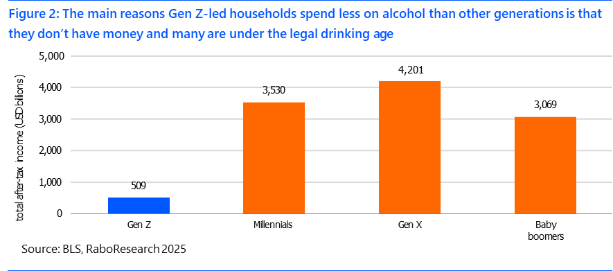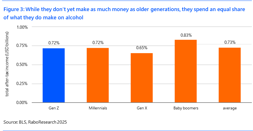 Actualmente, los miembros de la Generación Z, como todos los jóvenes de generaciones anteriores, están sin dinero. A medida que envejezcan, obtendrán títulos universitarios y de posgrado, y conseguirán empleos mejor remunerados. Este aumento en los ingresos hará que su gasto en alcohol aumente de forma casi automática. La pregunta es si la Generación Z seguirá bebiendo menos que las generaciones anteriores a la misma edad, o si, como sugirió el CEO de Brown-Forman, eventualmente beberá en niveles acordes con las normas históricas.