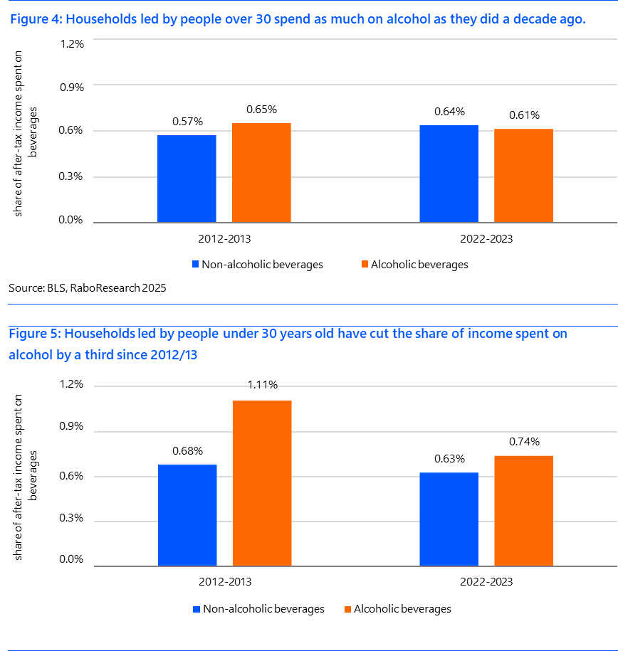 Hace una década, los hogares encabezados por personas menores de 30 años gastaban el 1,1% de sus ingresos en alcohol. Hoy, esa cifra se acerca más al 0,74% (ver figuras 4 y 5). Mientras tanto, el gasto en alcohol se ha mantenido prácticamente sin cambios en los hogares encabezados por personas mayores de 30 años. Estos datos sugieren que la Generación Z está gastando un tercio menos en alcohol hoy en día que los millennials de edad similar hace una década.
