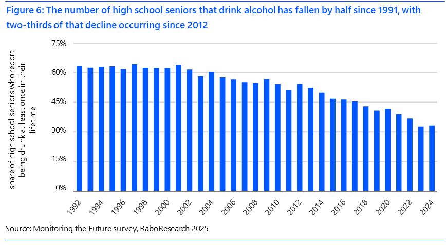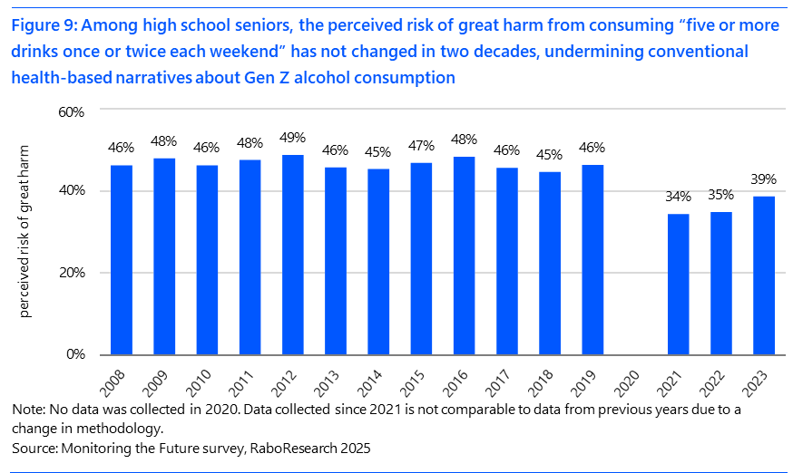 Sin embargo, si el principal impulsor es la vigilancia parental universal y la pérdida de privacidad, lo que hace que el consumo de alcohol en menores sea una actividad mucho más arriesgada que en el pasado, entonces esta condición o restricción desaparecerá a medida que la Generación Z se vuelva más independiente en sus años posteriores de adultez.