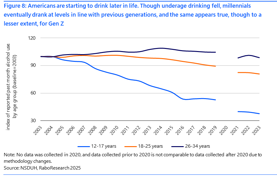 Los datos hasta ahora apoyan muy fuertemente esa conclusión. La figura 8 muestra un índice de la proporción de diversos grupos de edad que reportan haber bebido al menos una vez en el último mes. Los datos demuestran claramente que la mayoría de las disminuciones en el consumo observadas en años anteriores no persisten en la adultez y desaparecen prácticamente a medida que los consumidores llegan a mediados de sus 30 años. Dicho esto, no se verán a los primeros consumidores de la Generación Z llegar a sus 30 años hasta 2027, y la caída en el uso de alcohol reportado por el grupo de 18 a 25 años desde 2014 es un indicador de que esta resistencia puede estar deteriorándose.