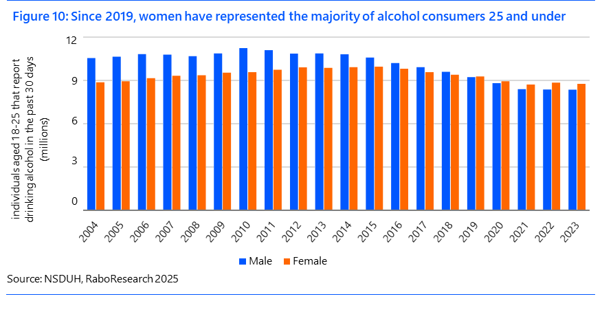 Las disminuciones en el consumo de alcohol de la Generación Z no se distribuyen de manera uniforme entre los grupos demográficos. De hecho, las caídas en el número de jóvenes hombres que consumen alcohol han sido las principales responsables de la mayoría de las disminuciones en el consumo de alcohol entre los jóvenes en los últimos 20 años (ver figura 10). Según la Encuesta Nacional sobre el Uso de Drogas y la Salud (Nsduh, por sus siglas en inglés), las mujeres ahora representan la mayoría de los consumidores adultos de alcohol de 25 años o menos.